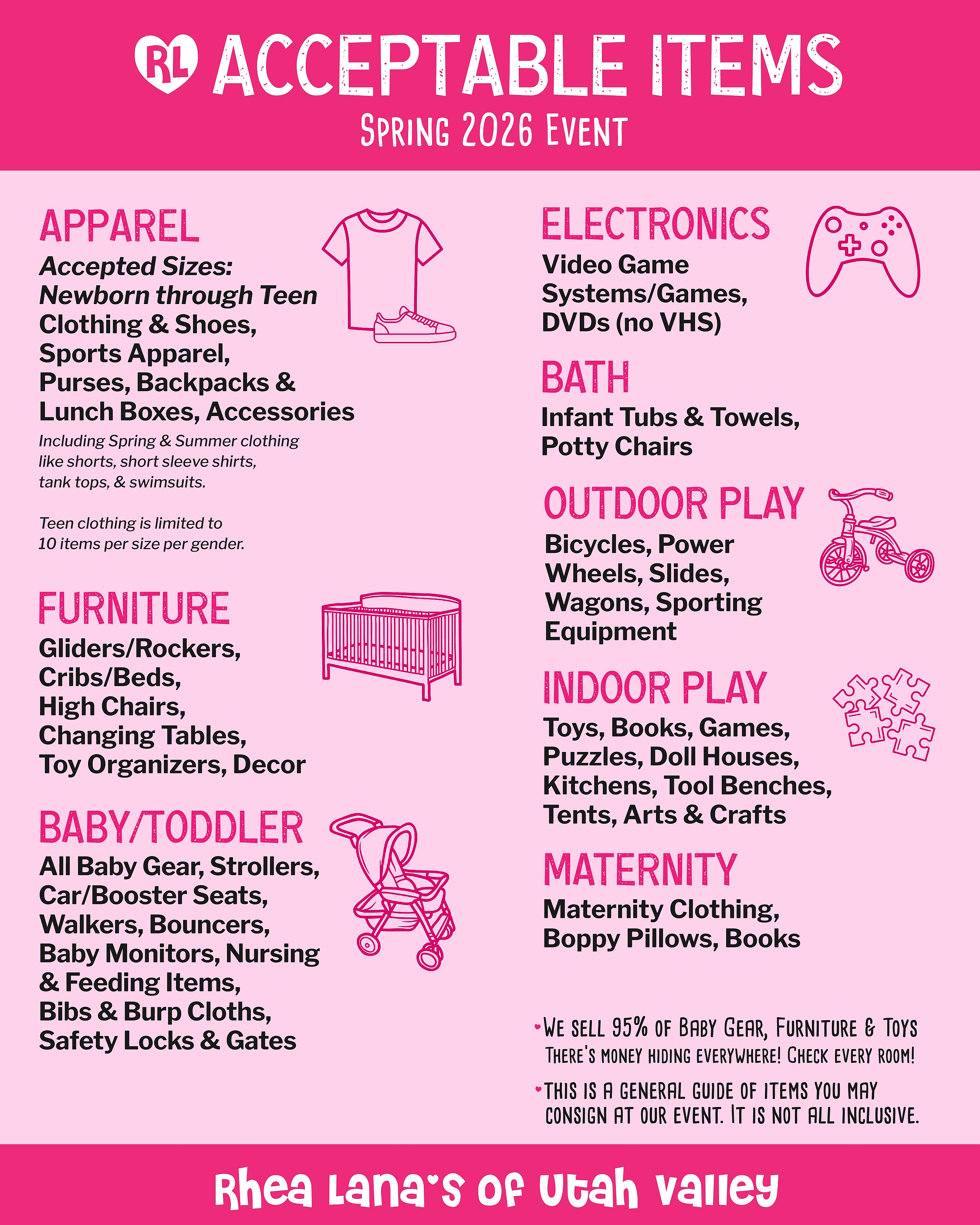 CHILDREN'S FURNITURE (beds, dressers, chests, chairs, tables, children's decor) sells great at our events, we will accept other household furniture pieces that are in excellent condition.